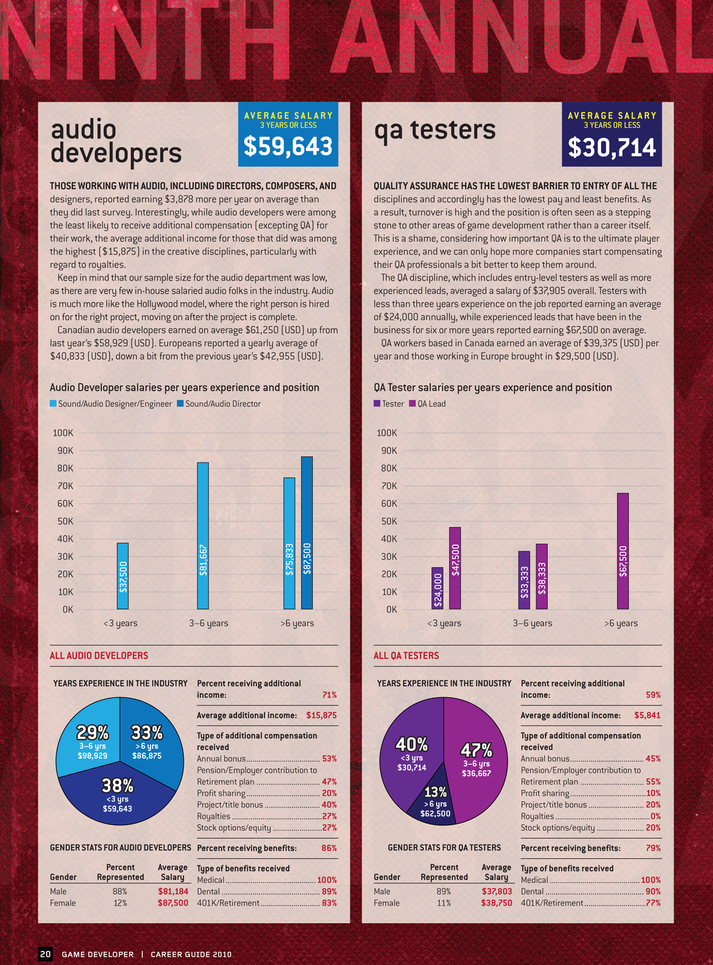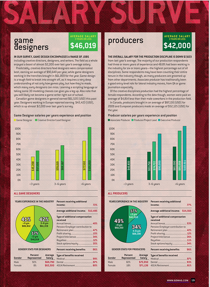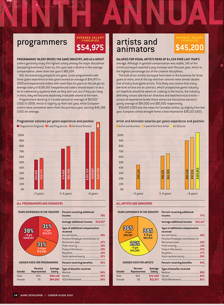 그럼 북미쪽은 어떨까요? 일단 급여부터 말씀드리면 당연 왠만한 사무직보다 많이 받습니다. 보다 객관적인 자료를 드리자면 가마수트라하고 Game Developer Magazine으로 유명한 CMP Media에서 매년 행하는 연봉조사(survey)가 있습니다. 다행히도 며칠 전에 그 결과를 무료로 공개했더라구요.